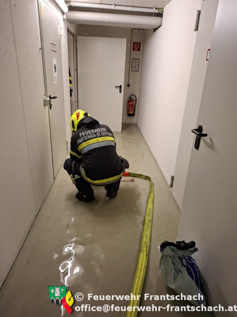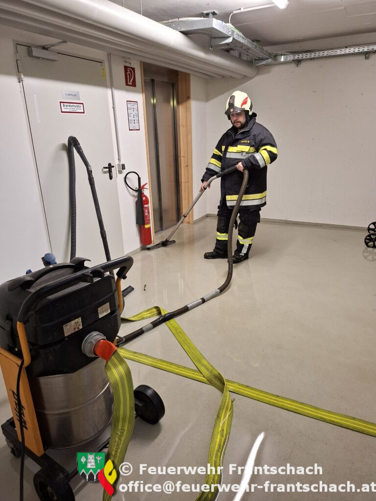 Aufgabe der FF Frantschach war es das ausgetretene Wasser mittels Tauchpumpen und Restlossauger abzupumpen und abzusaugen, weiters wurde der Liftschacht kontrolliert.
